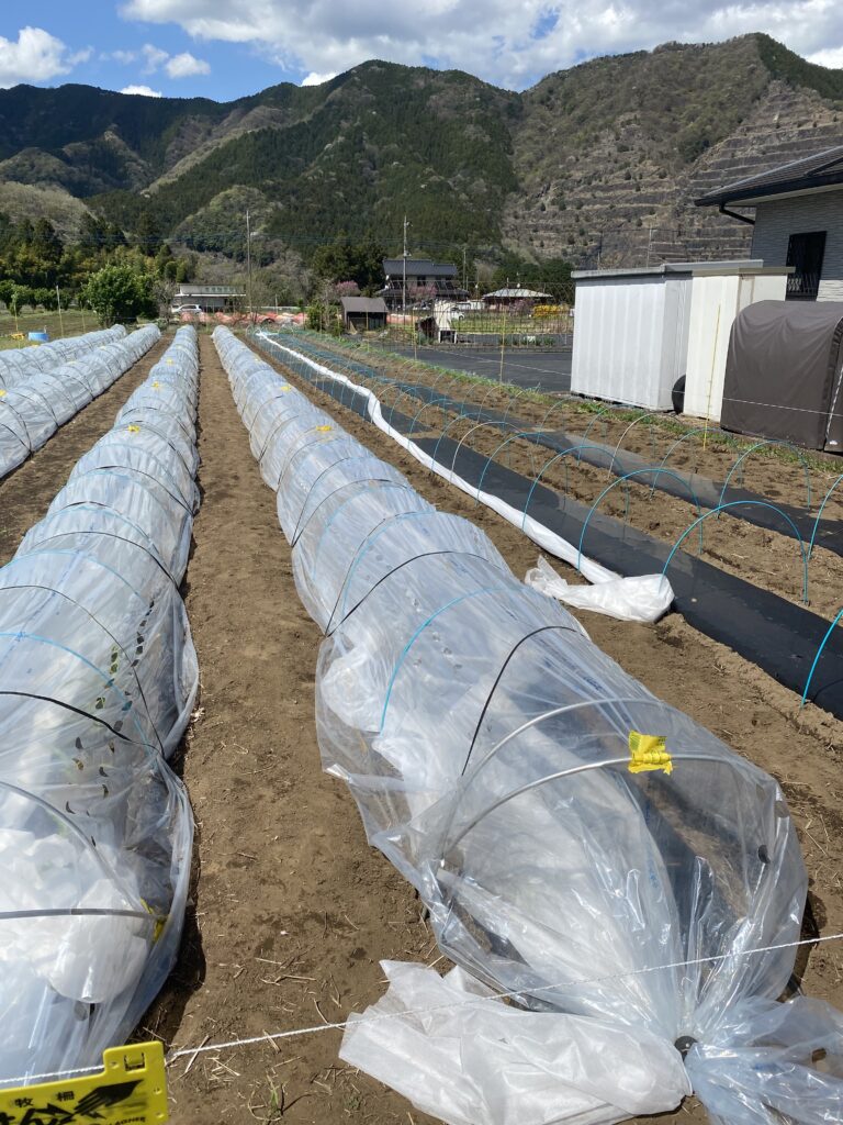 50m3本、ビニールをかけながらですが2人で1日弱の仕事で18時までかかりました。昨日の茨城の光景が思い起こされます。500m で何本もトンネルが続いてましたね。自分のやっていることが、ちっちゃくて、昨日の資材屋さんも迷惑に感じたんだろうな。