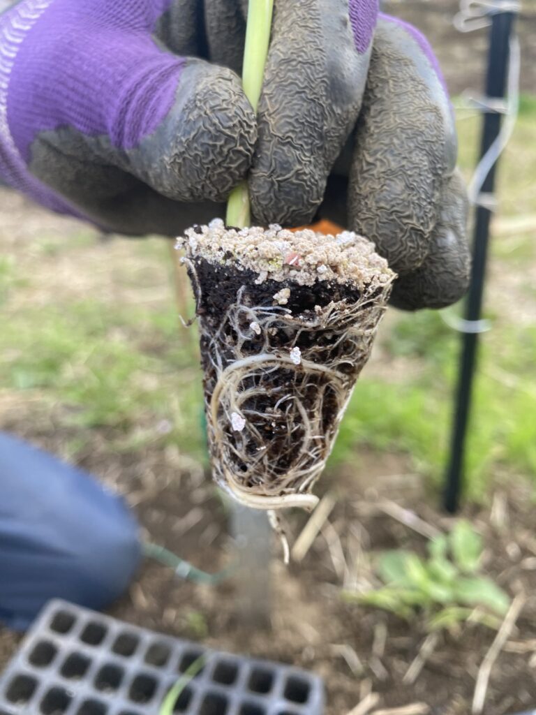 とうもろこしの定植です。まずは活着するように液肥にどぶ漬け、1時間置いて、マルチに穴を開けてそこにスポスポはめていきます。一定の間隔にするために板をあてがいます。根バチというらしいですが、真っ白で元気な根っこです。ちょっと定植が遅れたかな。