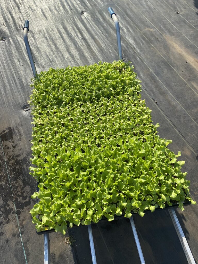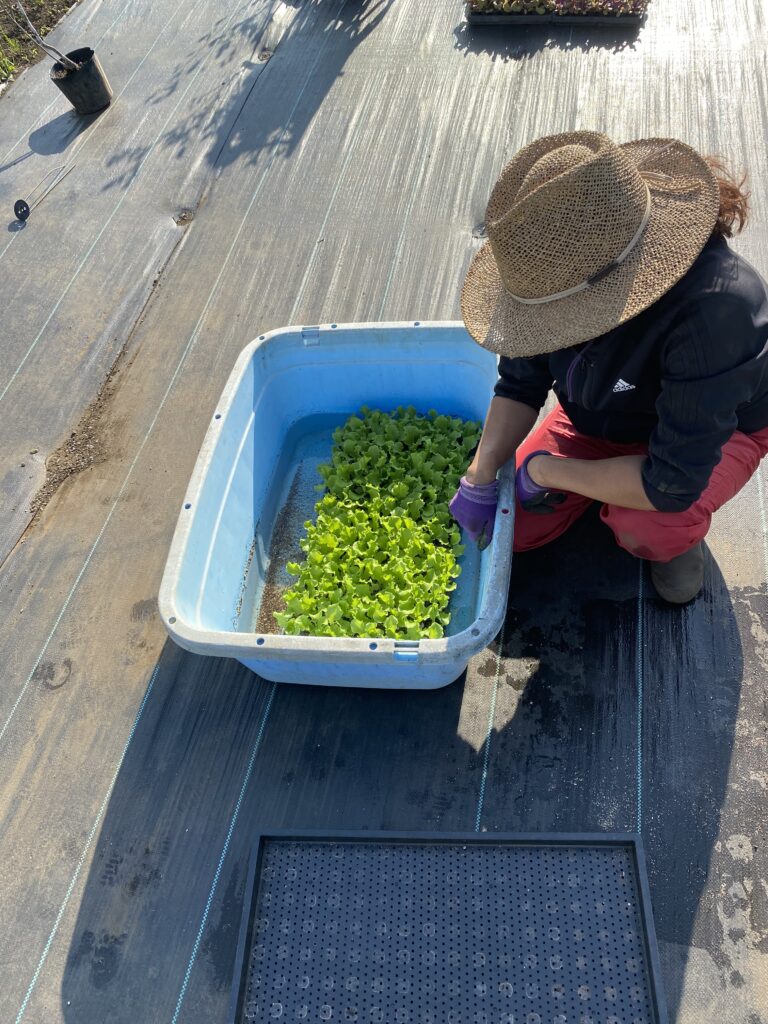 4時を過ぎて、レタスを定植します。8トレイ1千本。150円で売れて15万円かー。種代、肥料代、そして手間賃を考えると、もっと効率を上げないと。