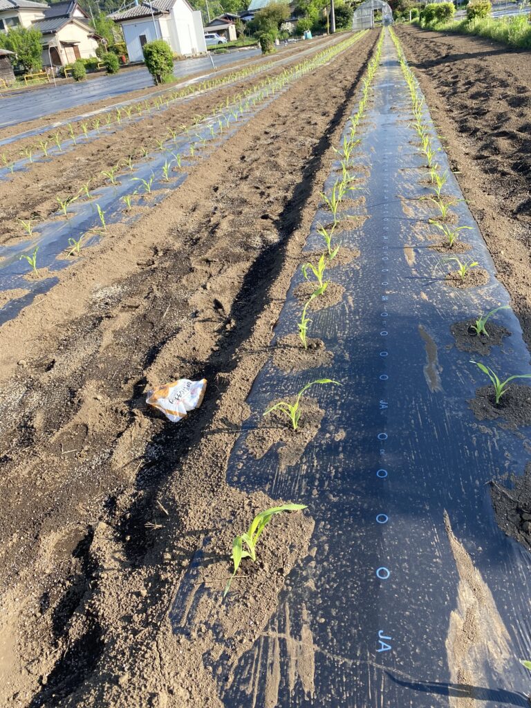 それからとうもろこしのビニールトンネルをはがします。ここからが勝負!たくましく育って欲しいです。風に飛ばされそうな不織布だけ巻き取り、マルチャーの準備。カドにマルチを張ります。