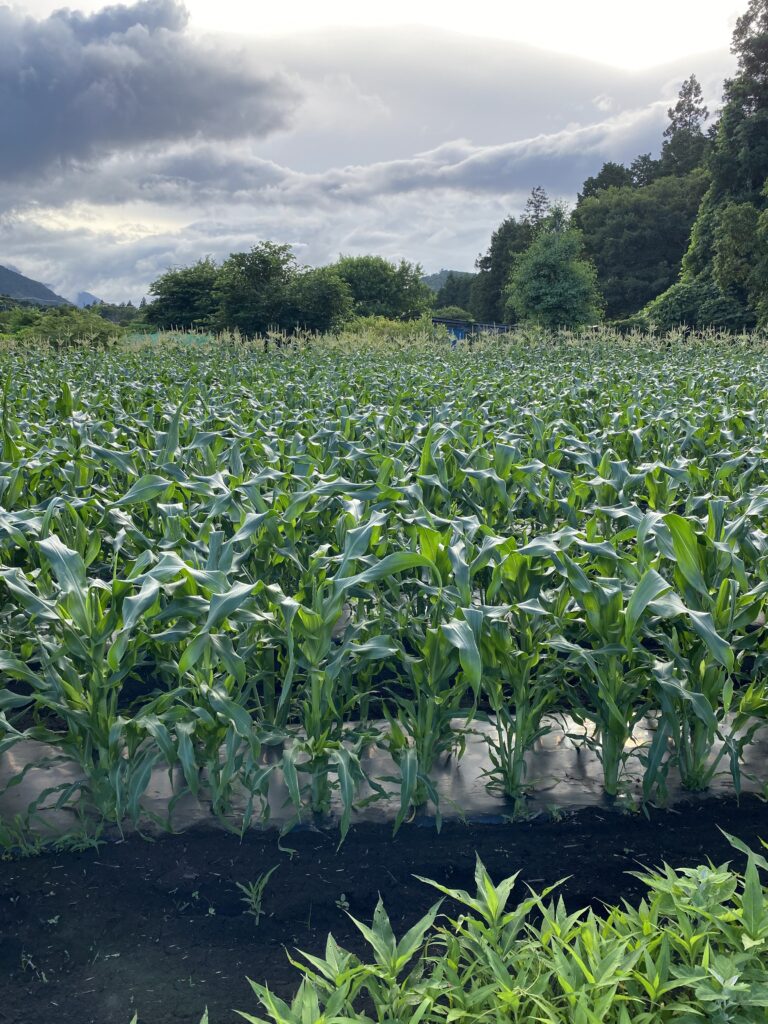 雨なのか、晴れなのか、晴れなのに雨なのか。通称、新永井さんと呼ばれている畑のとうもろこしがあと1週間で実りそうで電気柵を巡らせます。雨が降ってきて濡れますが日差しはあって、雨宿りをしようかと思って、もう少しだけと作業を続けていたら、雨はあがり、蒸し暑さだけが残ります。体からは湯気が。