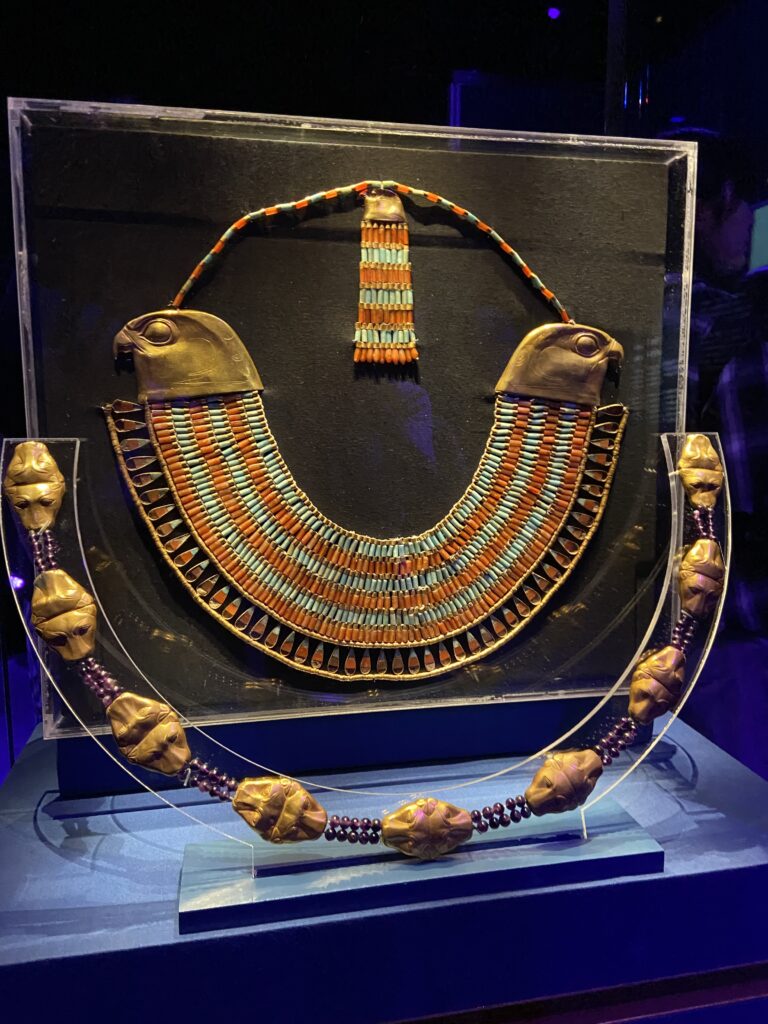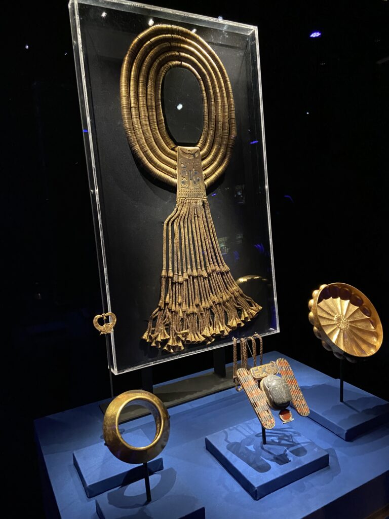それと黄金の首飾り。首元を飾りたいと昔から思ってたのね。そして首飾りの展示場では、女性が列をなしてその写真を撮ろうとしてて、Ryoko 曰く、このデザイン今でも通用するわ。そうかな?重そうだけど。しかもペンダントのところ糞転がし、昆虫でしょうよ。うーん。黄金でしょ。糞転がしでも良いわ。