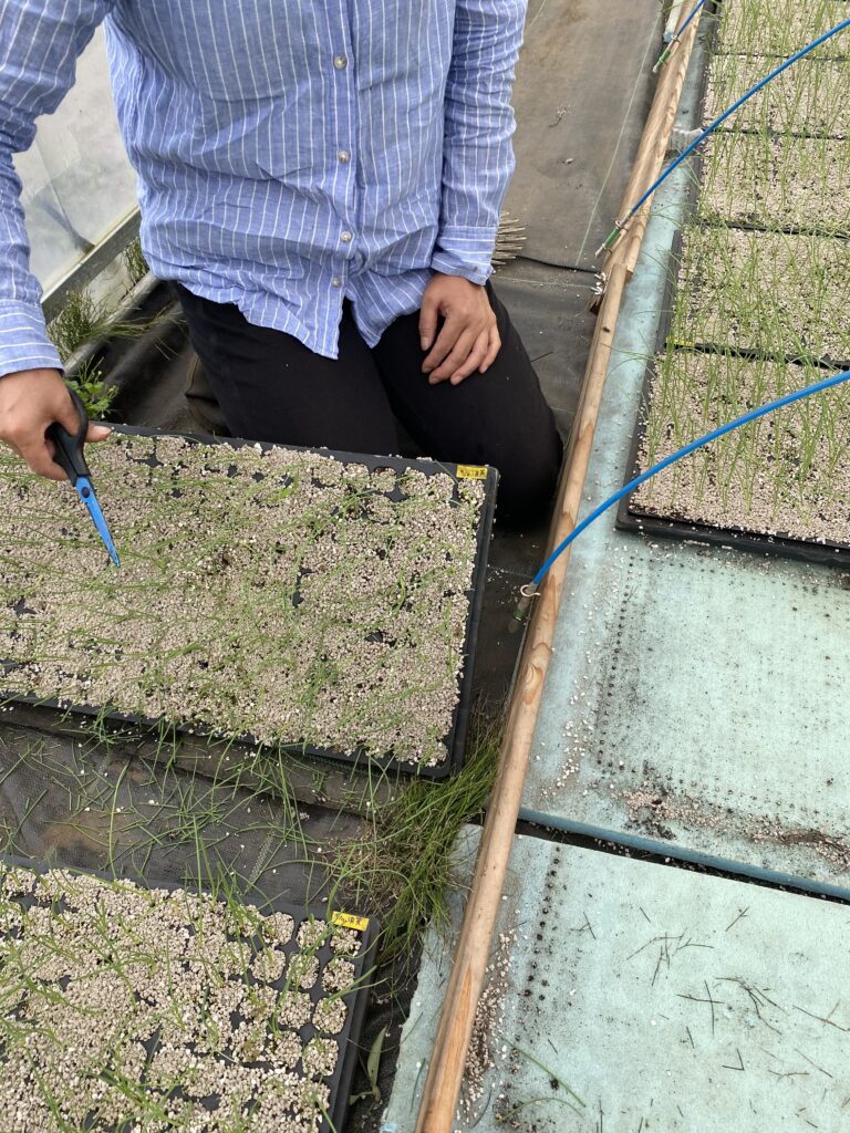 大根を1粒しか撒いてないので、出てこなかった穴にもう一粒追い撒きします。地味なことです。それから、ヒョロヒョロと伸びた玉ねぎの苗を散髪して、そうすると少し太るらしいのでやります。