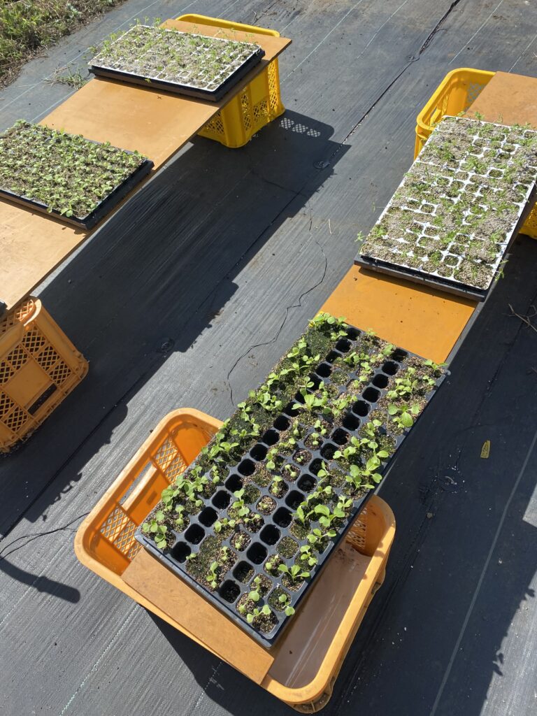 それがきっかけで育苗ハウスの横で会話が弾みます。これ、何の苗?白菜なんですけど、ちょっと間に合わないかも。そうだね、青野原は早いと11月の初めにも霜が降りるからそれに当たると厳しいかな。そんなに早く降りたら厳しいですね。でもこれより前の苗は定植したけれど熱くてマルチの押し花みたいになってしまって。そうなんだよまったくタイミングが取れないんだよ。