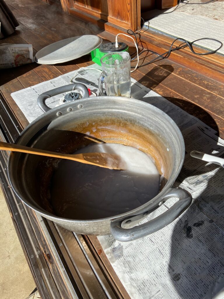 津久井のお宅の多くはお蚕をやっていた古民家が多く、本日お邪魔したお宅も暖かい陽が当たる縁側、大きな梅の木、柿の木のあるお宅で、羽釜でかまどで薪で湯を沸かし、蒟蒻を作ります♪
