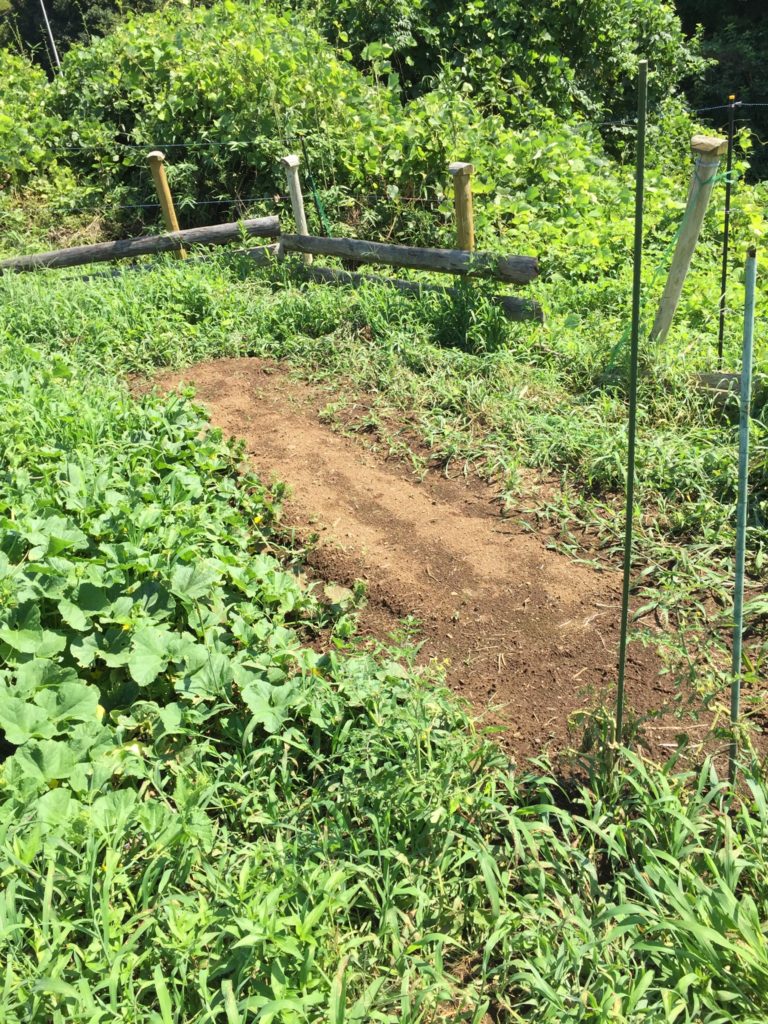 きゅうりは、梅雨で病気になり、更に、かぼちゃに居場所を奪われて、消えていきました。そこで、再度育苗、秋取れきゅうりを目指します。徒長気味ですが、来週には定植をしないといけないので、牛糞の元肥と、微生物資材を撒き、更に畝を立て、置き肥料をします。それから、白黒マルチを張って、、、。