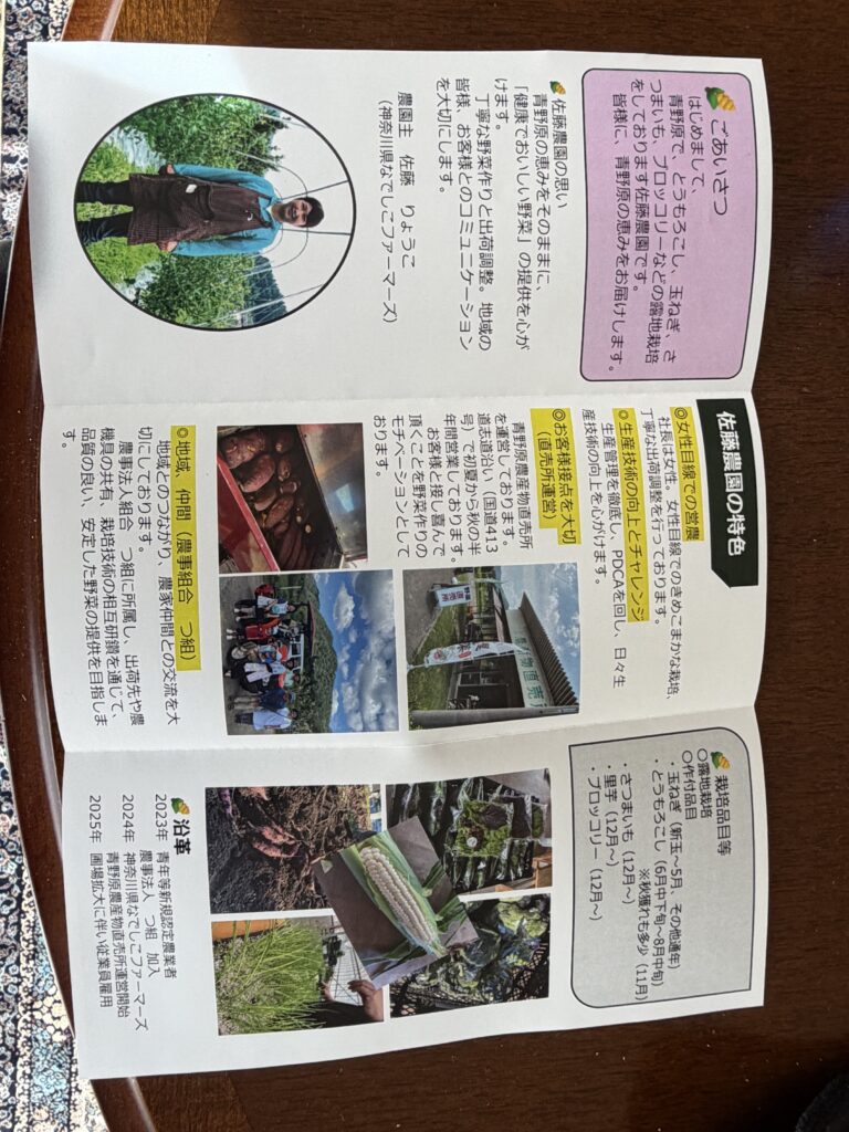 海老名SAの飲食、売店を仕切っている。農産物の販売もやっているが横浜市場のヤマシゲさんに任せきりで地元の野菜も入れたい。青野原の野菜なら昼夜の寒暖差が大きく美味しそうだ。時期が来たらお声掛けする。自分でSAで売るのも良い。