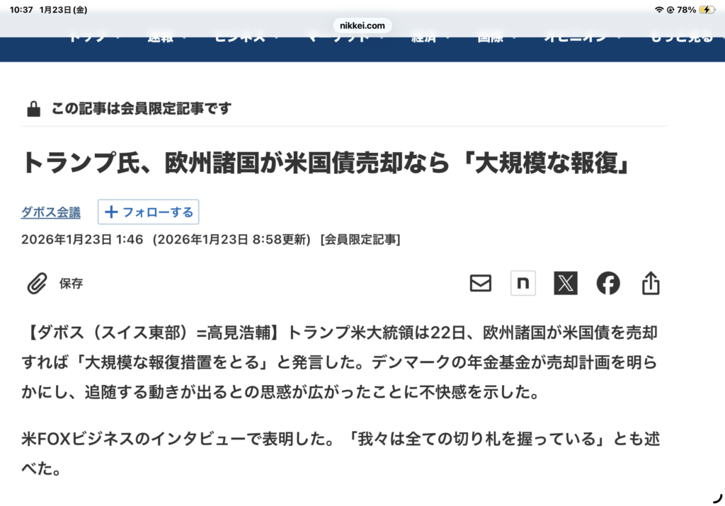 デンマークの年金機構がグリーンランド問題を受けて、うーんどうも米国は信用なんねーな、もしかしたら俺たちもロシアと同じような憂き目に合うかもしれない。それで米国債を売っちゃった。