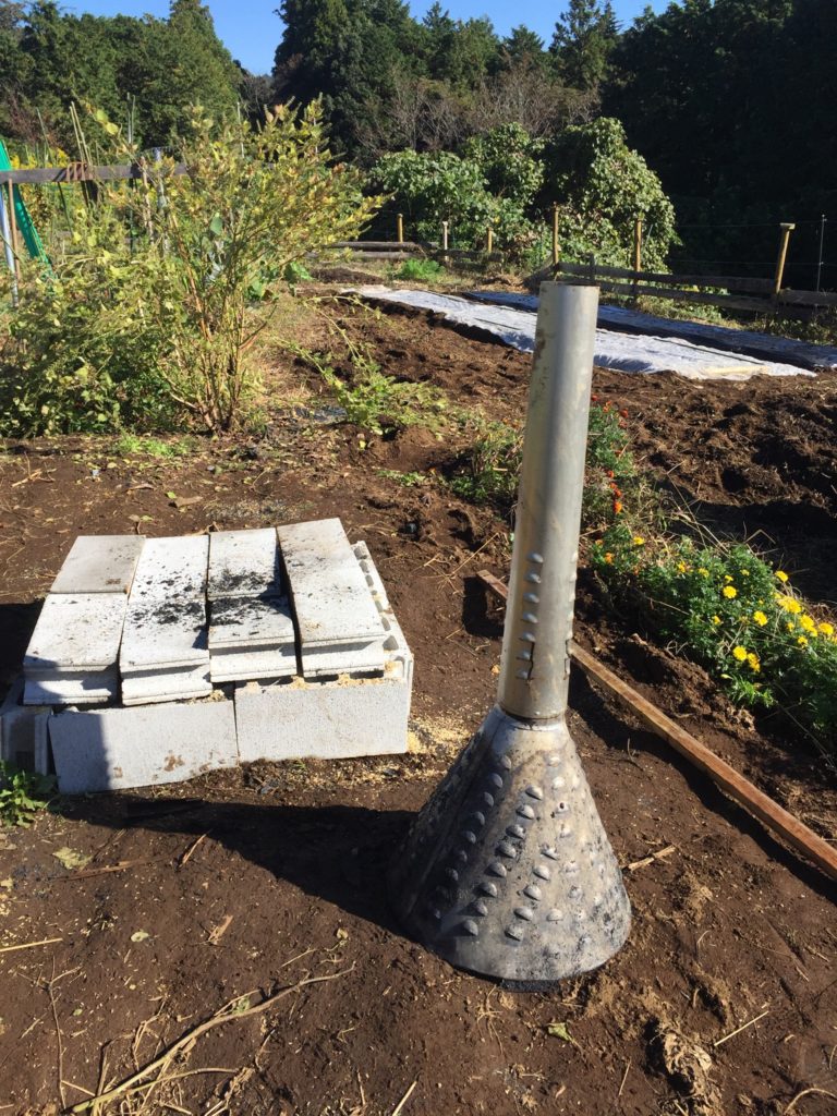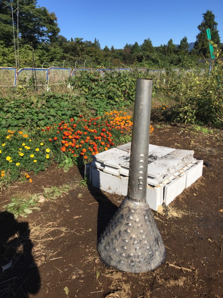 昨週、カントリーエレベーターから頂戴したもみ殻で、燻炭を作ります。発注しておいたクンタン機をコメリで購入し、風で飛散しないようにブロックで囲い、その中で焚き火を開始しますー木材に火がついたらクンタン機を被せて、周りにもみ殻を盛ります。