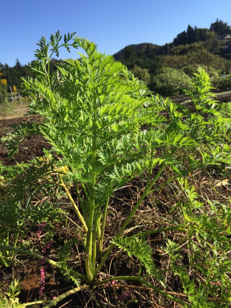 下の写真はにんじんです。にんじんは不思議な野菜です。密生を好み、連作可能、でも発芽がとても難しい。ここまで育てることができたのは、今回が初めてで、ピンセット種まきの成果です。