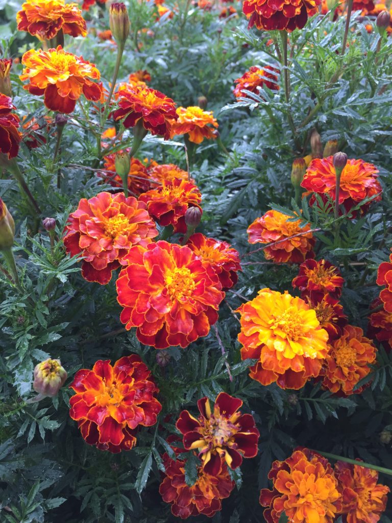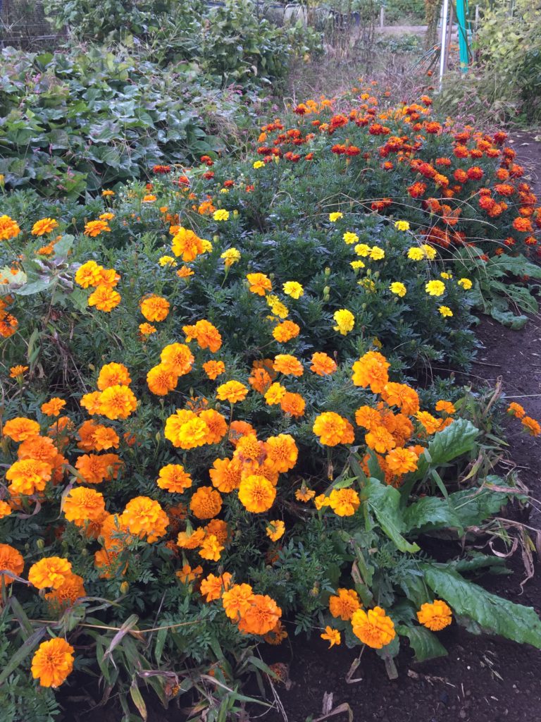 咲き誇るマリーゴールドです。この香りと紫蘇の香りで害虫を寄せません。ナスとトマトをしっかりガードしてくれました。