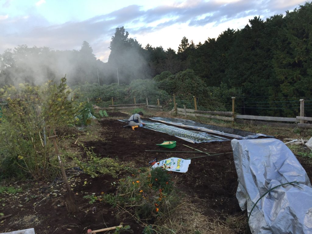 クンタン作りの中、ピンセットで小松菜、ほうれん草、レタスを定植しています。ほうれん草、小松菜はテンマキで栽培するのが普通ですが、冷蔵庫で発芽させ、プラグトレイで育苗、そしてピンセットで、マルチに定植し、最後にネットをかけて防虫です。ここまで丁寧に作る人は滅多にいません。