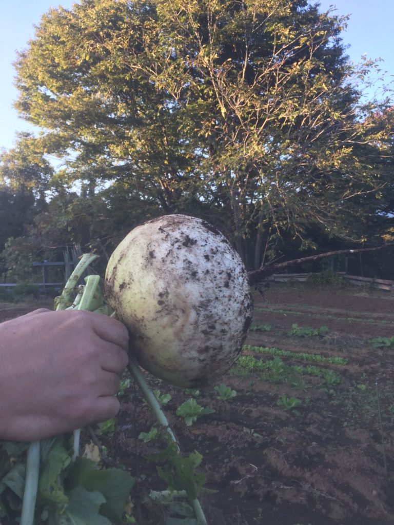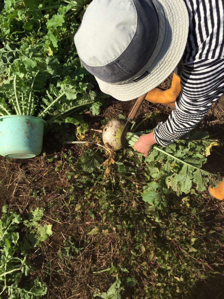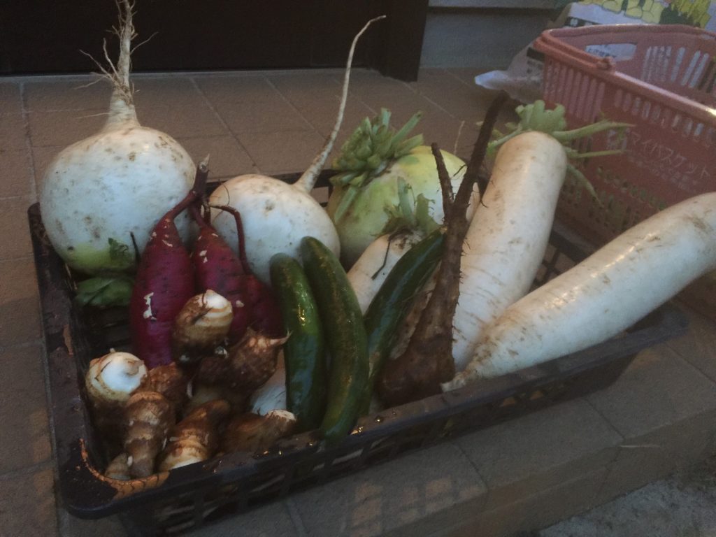 本日の収穫です。大根やサトイモなど、地中系が中心でした。